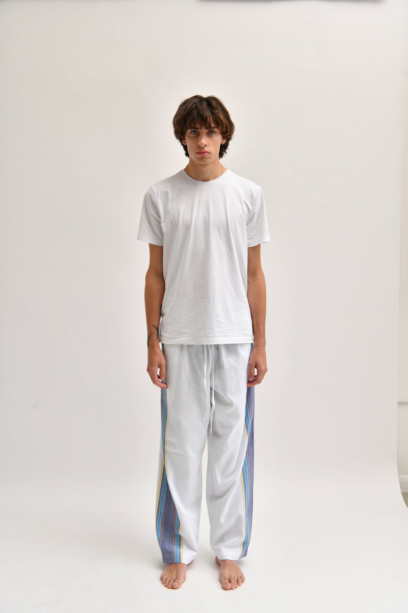 These white and blue trousers are inspired by the stunning contrasts of Paros, where whitewashed buildings meet the deep blue of the Aegean Sea.Crafted from soft cotton kikoy, they offer the perfect combination of comfort and style. Breathable like linen but softer, these versatile trousers easily transition from beachwear to loungewear or even sleepwear. Ethically made, they’re ideal for lounging, travel, or casual wear at home.