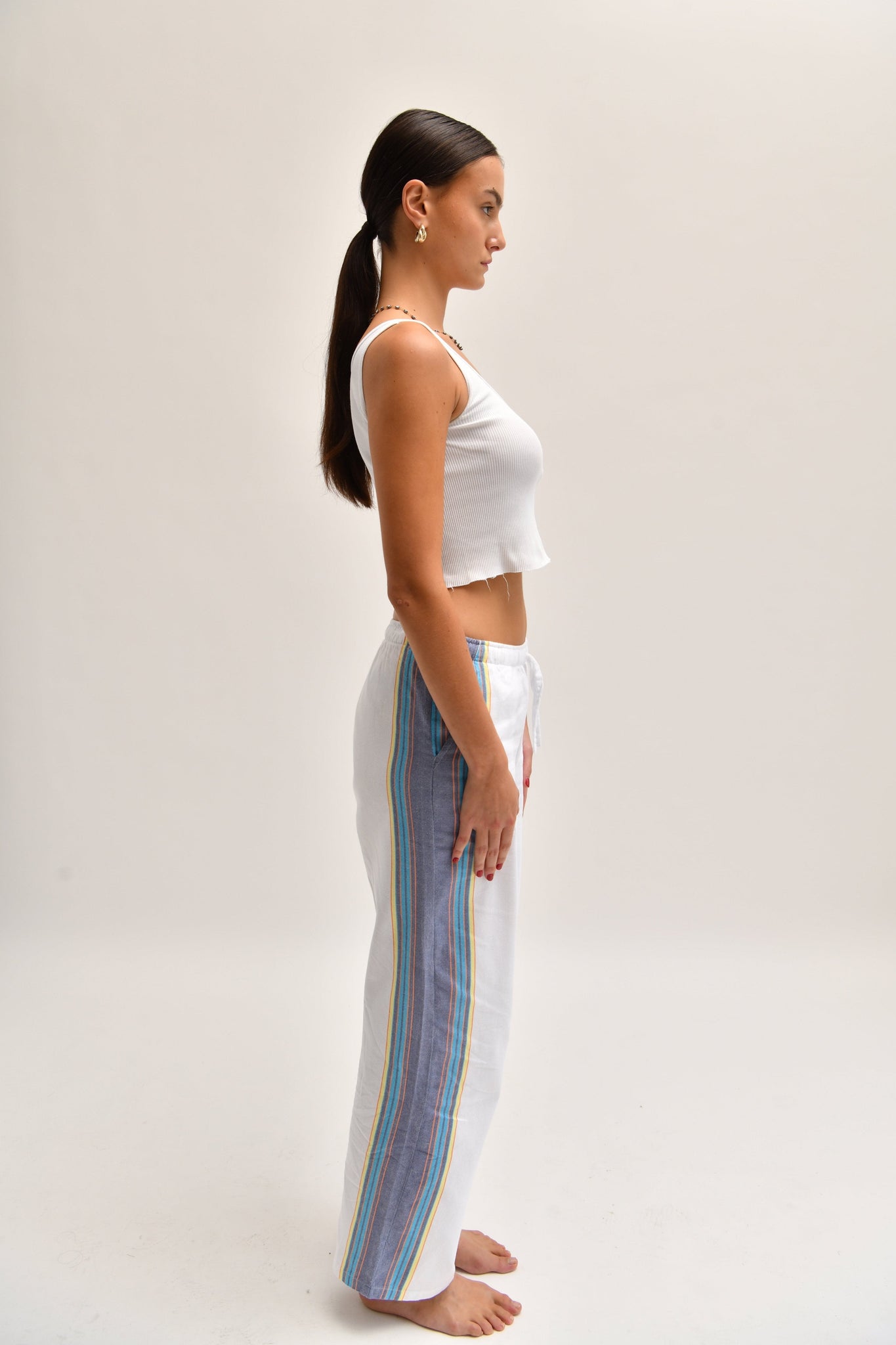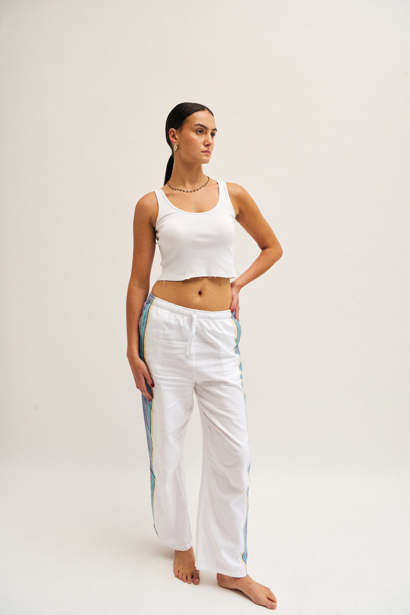 These white and blue trousers are inspired by the stunning contrasts of Paros, where whitewashed buildings meet the deep blue of the Aegean Sea. Crafted from soft cotton kikoy, these trousers offer the perfect balance between comfort and style. Breathable like linen but softer, they seamlessly transition from beachwear to comfortable loungewear or sleepwear. Ethically made and designed for maximum versatility, these pants are perfect for lounging, travel, or even working from home.
